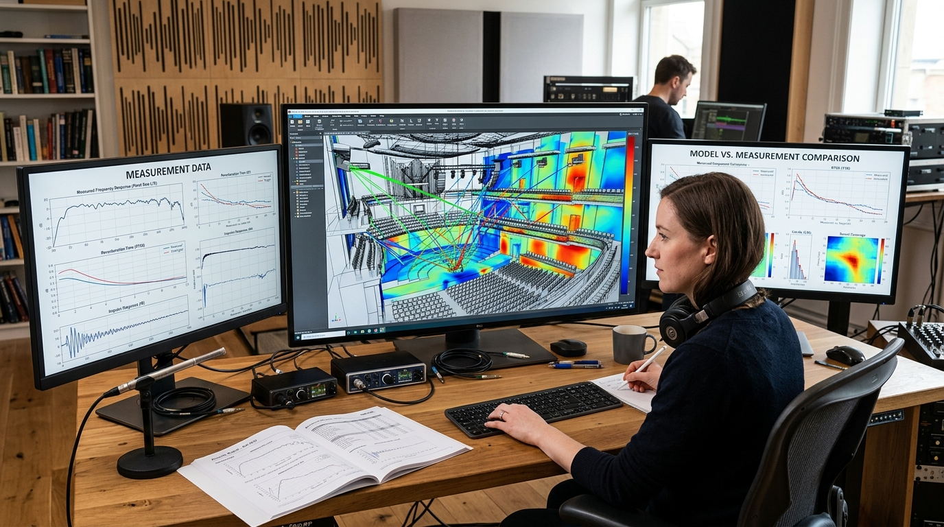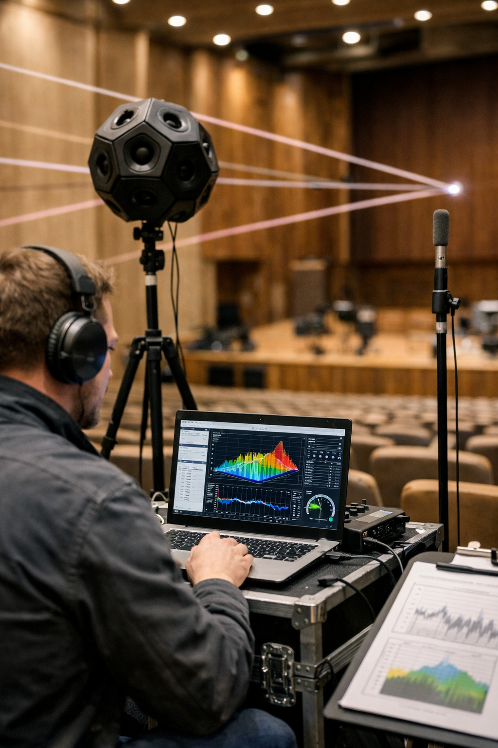 — выезд инженера на объект и натурный замер ключевых параметров: RT60, STI, SPL, звукоизоляции, фонового шума и характеристик отражений. Работа ведётся на собственном откалиброванном оборудовании — без аренды и зависимости от сторонних подрядчиков. В день выезда заказчик получает первичные данные, на которых строится весь акустический проект.